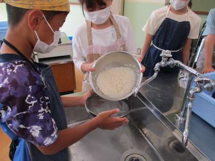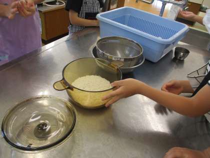 お米が研げたらざるで水を切り,お鍋にこぼれないように入れます。