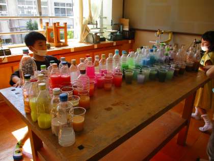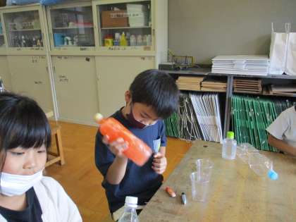 図画工作の時間では,「カラフルいろ水」を学習しました。ペットボトルのキャップに絵の具をつけて,ペットボトルに水を入れ振ると…すてきないろ水ができました!