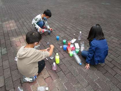 図画工作科「カラフル いろみず」の学習をしました。キャップに絵の具をつけてペットボトルをふると,透明だった水がきれいな色に変化しました。「おもいろい!」「絵の具を混ぜてみよう!」とみんな楽しそうに活動していました。ジュース屋さんを開いているグループもありました。