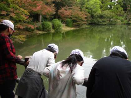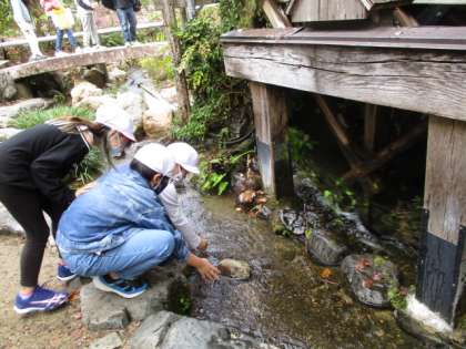 池の中をのぞいてみると・・・鯉が泳いでいました。アメンボやめずらしい木を見つけたグループもありました。