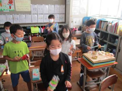 学習の最後に,音楽で学習した曲に合わせて,自分だけの楽器を演奏しました。