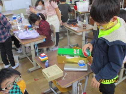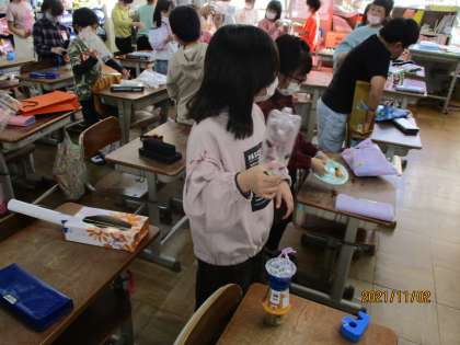 図工の学習で,いろいろな素材を使って,音のなる楽器を作りました。