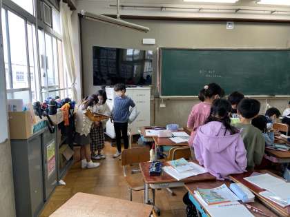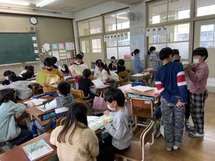 国語の学習で,1年生への読み聞かせをする本を話し合いで決めました。読み聞かせ本番までにグループで練習をたくさんしました。