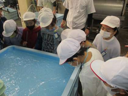 工場の見学をさせていただきました。実際に近くで出来上がったこんにゃくを見たり,触ったりしてこんにゃくへの関心が深くなっていました!
