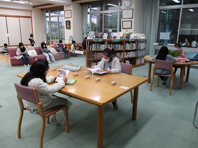 図書室で読書の時間です。毎週1時間あるこの機会を,みんなとても楽しみにしています。