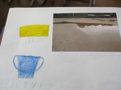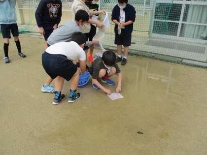 なぜ水とりが国語…?と思うかもしれませんが,「よりよい学校生活のために」の学習であるグループから「晴れている時の運動場の水たまりをとって遊べるようにしたい」という提案から実現したものです。だいぶ前の学習でしたが,「今日だ!」と思ってやってみました。(希望者のみ)