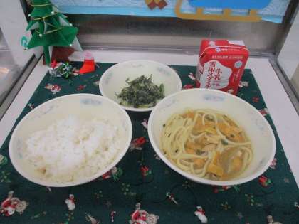 12月10日(金)の給食は,減量ごはん,牛乳,カレーうどん,だいこん葉のごまいためでした。