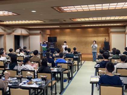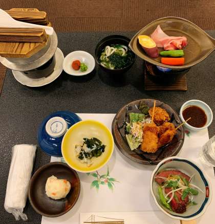 お待ちかねの夕食の時間です。たくさんのお皿が目の前に並んでいますが,どれもおいしそうですね。食事も旅行の楽しみの一つですから,味わっていただいてください。