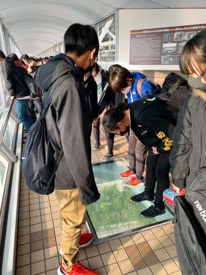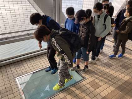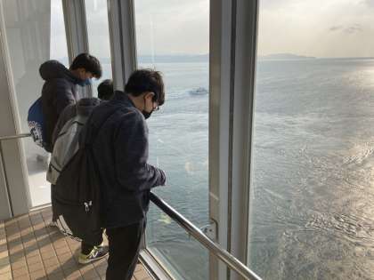2日目の最初の活動は「鳴門の渦潮」の見学です。大鳴門橋には渦潮を見ることができる施設があります。眼下に広がる鳴門海峡をながめて,景色を楽しんでいます。