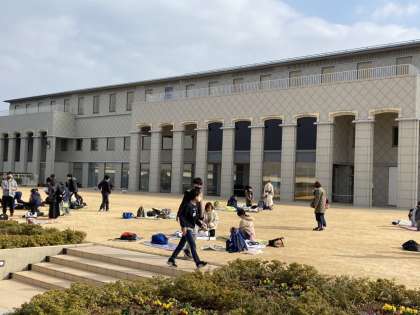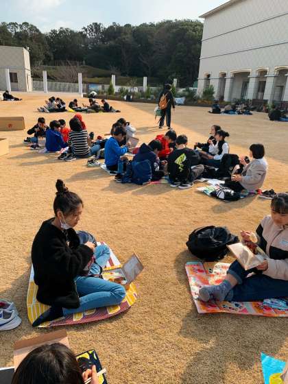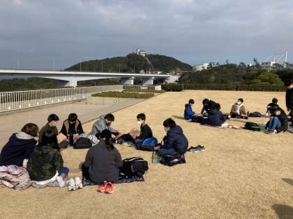 みんなでお昼ご飯を食べています。天気が良いので,気持ちよさそうですね。