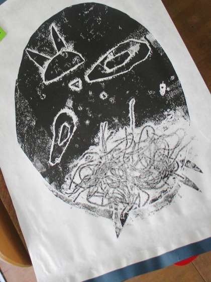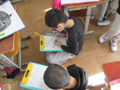 自分の作品も振り返りました。「ここが上手くいった!」,「かわいらしさを出すために,つのをプチプチの材料にした!」など,頑張ったところをワークシートに書きました。