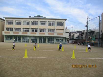 コーンのまわりを回る「ぐるぐるリレー」や