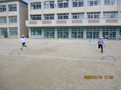 ミニハードルを跳び越える「ぴょんぴょんリレー」の