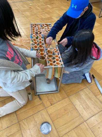 みんなで話し合った方法で,代表の子たちが,傘を入れる竹の筒を紐で縛っていきます。