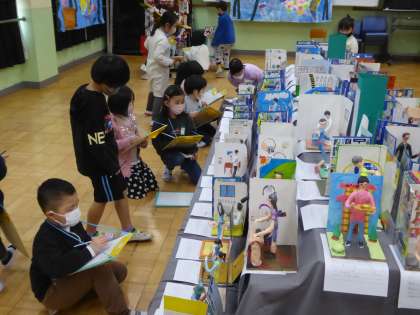 多目的室で開催している図画工作作品展で鑑賞をしました。1年生の作品だけではなく,全校の作品があり,1年生も大喜びで良さ見つけをしていました。