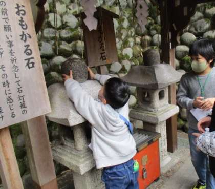 鳥居は千本あるのか数えている子がいたり,おもかる石が思ったより重いことにびっくりしたりしていました。