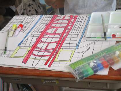 絵の具で色づけを始めています。思い思いの色をパレットにとり,丁寧に仕上げています!