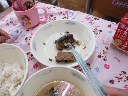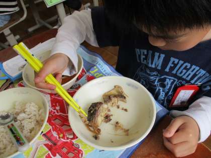 今日の給食でさばが出ました。おはしで魚の真ん中に切れ目を入れて,きれいに骨を残しながら食べることができました。きれいに骨をとれ,喜んでいる子がいました。