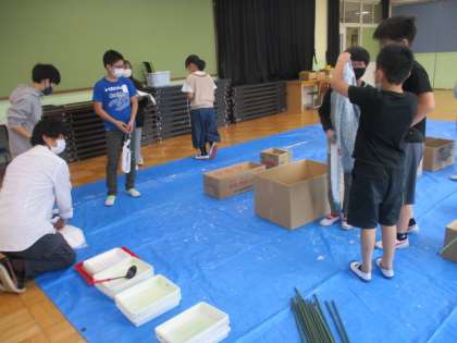 液体粘土を使ってタオルを固めます。出来上がりが楽しみです。