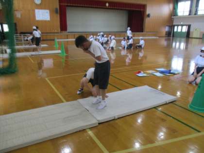 体力テストの様子です。ペアの人と協力して記録しています。褒め合ったり,励まし合ったりしている姿も素敵です!