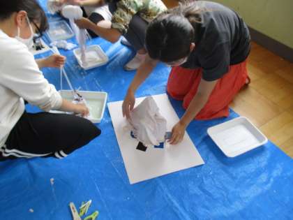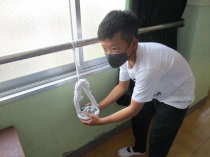 液体粘土をつけたら,最後は土台にかぶせたり,ひもや洗濯ばさみでつるしたりしました。