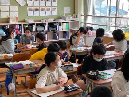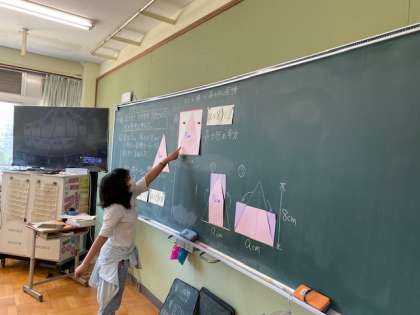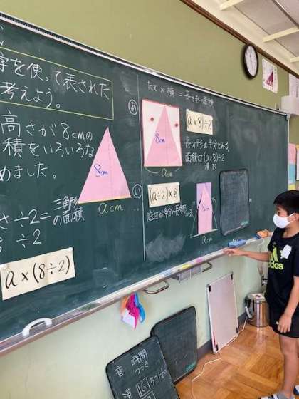黒板の図を動かしてみたり,友達の発表を聞いたりする中で,少しずつ理解でき,隣の友達と説明し合うこともできるようになっていました。