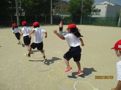体育科の学習では,まねっこ遊びをしています。友だちについて行くだけでも楽しい子どもたち。「どんな動きをするのかな。」とわくわくしながら学習に取り組んでいました。