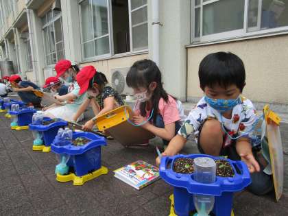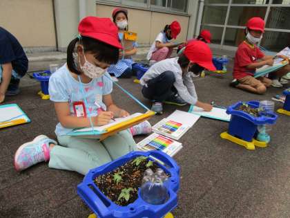 目でよく見たり,指でさわってみたりとあさがおの芽を観察しました。「葉っぱがハートの形だ!」「茎は緑じゃないんだね。」といろいろなことに気が付きました。
