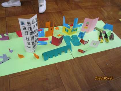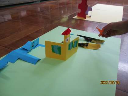 今日は「おって,たてて」の学習で町を作りました。折って,切って,立ててみると,いろいろな作品ができました。「魚みたい!」「火山ができたよ!」!「テントができた!」などひとりひとり違ったものができました。とても楽しい町が完成しました。
