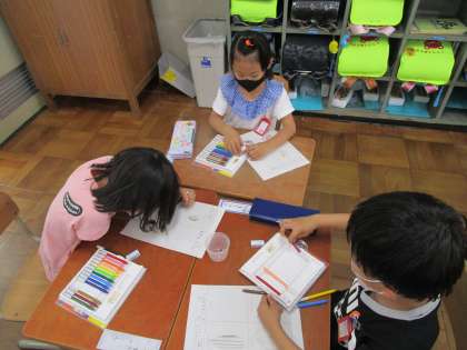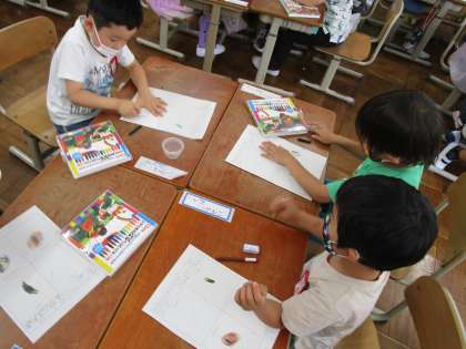 ひまわり,ほうせんか,ふうせんかずら,こすもすの種を観察をしました。よく見たり,触ったりしながら,それぞれの特徴を絵に表しました。似ているけれど違うところもあるねとみんなで共有しました。どんな芽が出るのかなの成長を楽しみにしている姿も見られました♪