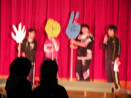 グー・チョキ・パーにした大きな手を使っての集団ジャンケンやステレオゲーム,反対言葉等,会場のみんなもとても盛り上がりました。