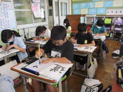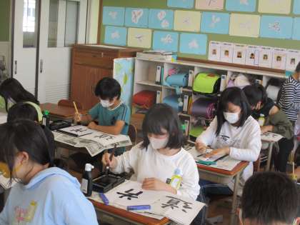 書写の学習で「道」を書きました。背筋を伸ばして,筆を立て,紙をしっかり押さえて一生懸命書く姿が見られました。「しんにょう」に苦戦していましたが,練習を繰り返したり,筆の穂先の向きや書き始めの位置を確かめたりすることで,納得のいく一枚を仕上げることができました。