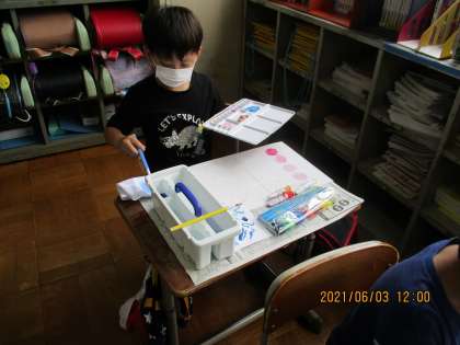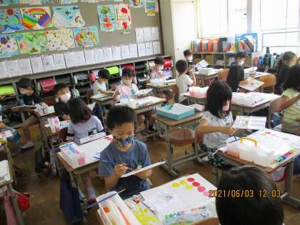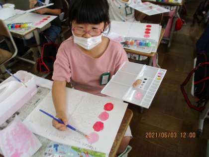 図画工作科では,待ちに待った絵の具セットを使いました。新しい道具に子どもたちは興味津々。道具の名前や,配置の仕方などを学習した後,いよいよ絵の具を使います。絵の具と水の量を調節したり,白を混ぜてみたりと新しい発見に嬉しそうでした。