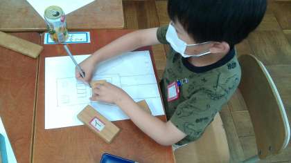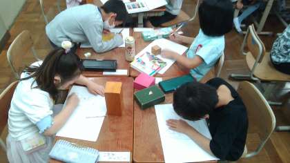 積み木や空き箱,空き缶の面を写し取り,面の形の特徴を利用して絵を描きました。写した形の特徴をとらえ,どんな絵にしようかイメージを膨らませることができました。