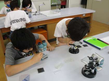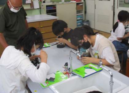 理科「生命のつながり」の学習で,メダカの卵を顕微鏡を使って観察しました。顕微鏡を使うことで,目が見えたり,卵の周りがふわふわしていることに気付いたり,たくさんの発見がありました。なんと,観察中に卵からメダカが誕生しました!