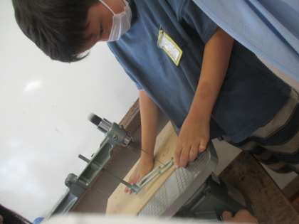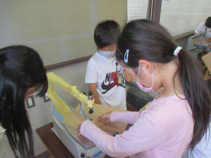 今日は,自分のデザインの下絵を電動のこぎりでくりぬいていきました。思ったよりも力がいり,難しかったですね…