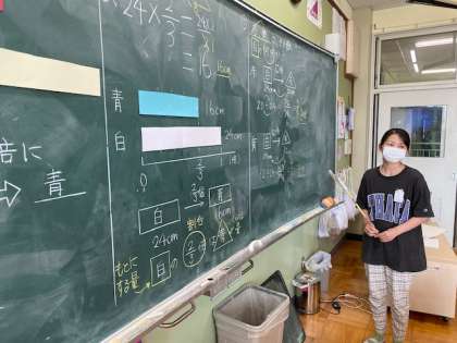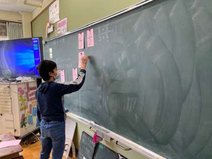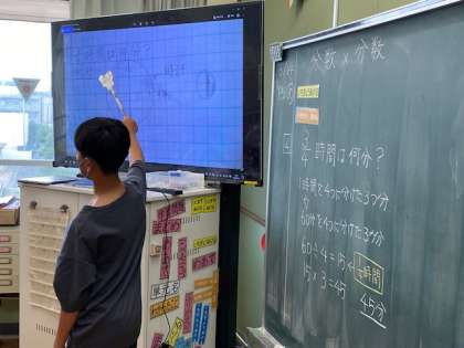 分数×分数の学習は,時間を分に直したり,逆数など新しい概念を獲得したり,これまで学んだ速さや割合なども出てきたりして,子どもたちを悩ませていますが,みんなで考えを出し合って学習しています!