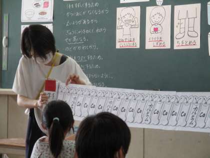 栄養教諭の先生と食育について学習しました。牛乳には,カルシウムがたくさん入っていることを知って子どもたちは驚いていました。