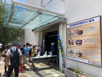 野島断層保存館の見学中です。はじめに阪神淡路大震災で地表に現れた野島断層の本物を見ました。最大1.3mのずれがあったそうです。