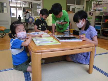休み時間の様子です。3組の教室で友達と本を見たり,ブロック遊びをしたりしています。コマ回しや人形遊びも好きです。