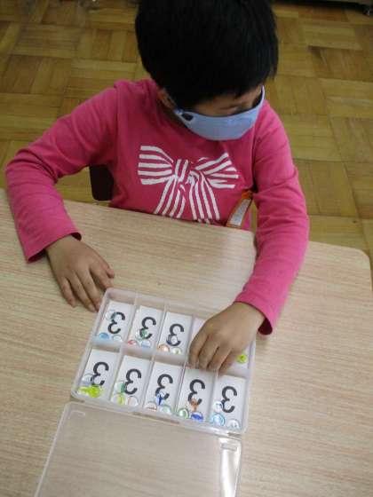 算数の数の学習です。おはじきを同じ数ずつケースや袋に入れています。集中して取り組んでいます。