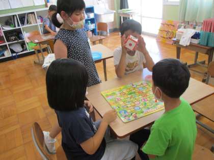 オセロやパズルなどをしています。すごろくが人気で順番にサイコロをふって盛り上がっていました。
