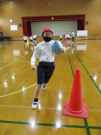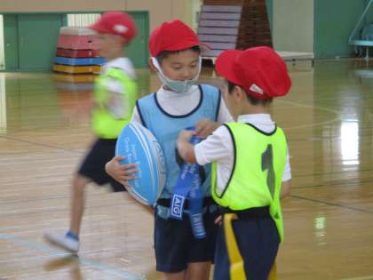 ラグビーボールをかかえてゴールまで走っています。タグを取られないように相手をかわしながらゴールまで目指します。タグを取るチームは3〜4人程度で作戦を立てて相手のタグを取ります。タグを取った後は手渡しで友達にタグを「どうぞ。」と言って返します。受け取ったら「ありがとう。」と言う姿が見られました。トライができるように頑張っています。タグとり遊びが子どもたちは大好きです。