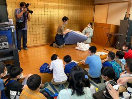 夕食後にホテルの方から布団の敷き方を教えていただきました。部屋リーダーが代表で聞きました。