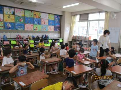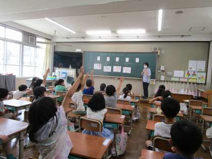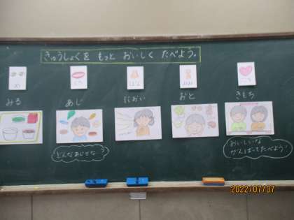 栄養教諭の久保田先生から目・口・鼻・耳・気持ちを使いながら食べると食べ物がよりおいしくなるんだよと教えてもらいました。子どもたちは給食時間にいろんな方法を試しながら,苦手なものに挑戦している姿が見られました♪
