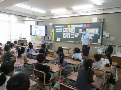 警察の方に来ていただき,社会のルールについて学習しました。子どもたちに質問を投げかけながら,分かりやすく教えてもらいました。みんな真剣に聞いていました。