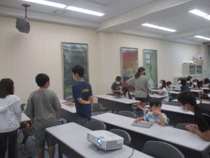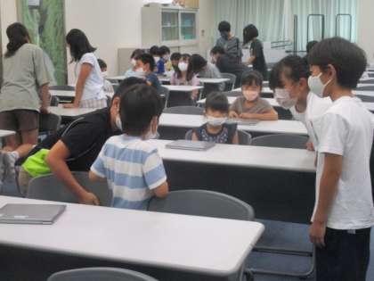 タブレットの使い方を教えに1年生のもとへ。まずは自己紹介から。
