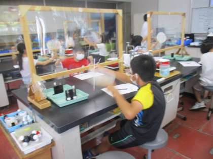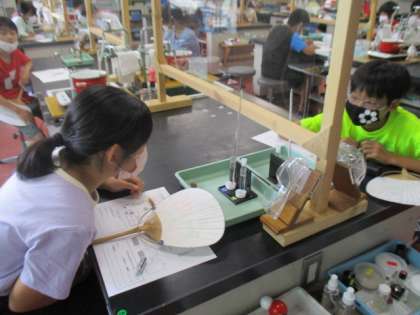 エタノールを付けてうちわであおぐ実験をしてみました。みるみる温度が下がってびっくり!