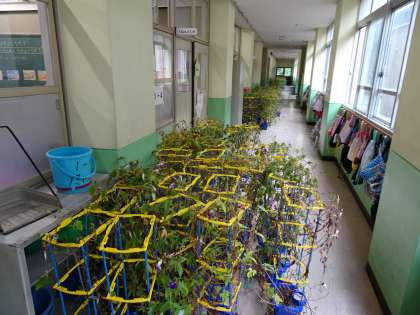 1年生の教室前のろう下を通ると、アサガオの植木ばちがろう下にたくさんならんでいます。いつもは中庭にあるのに、どうしてかな?