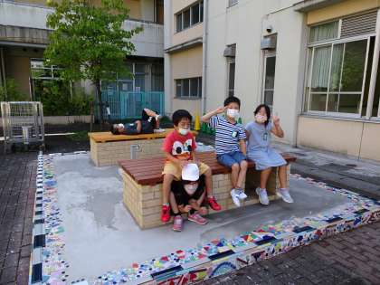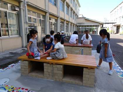 9月12日(月)中間休み 中庭の「かまどベンチ」つかえるようになりました!
